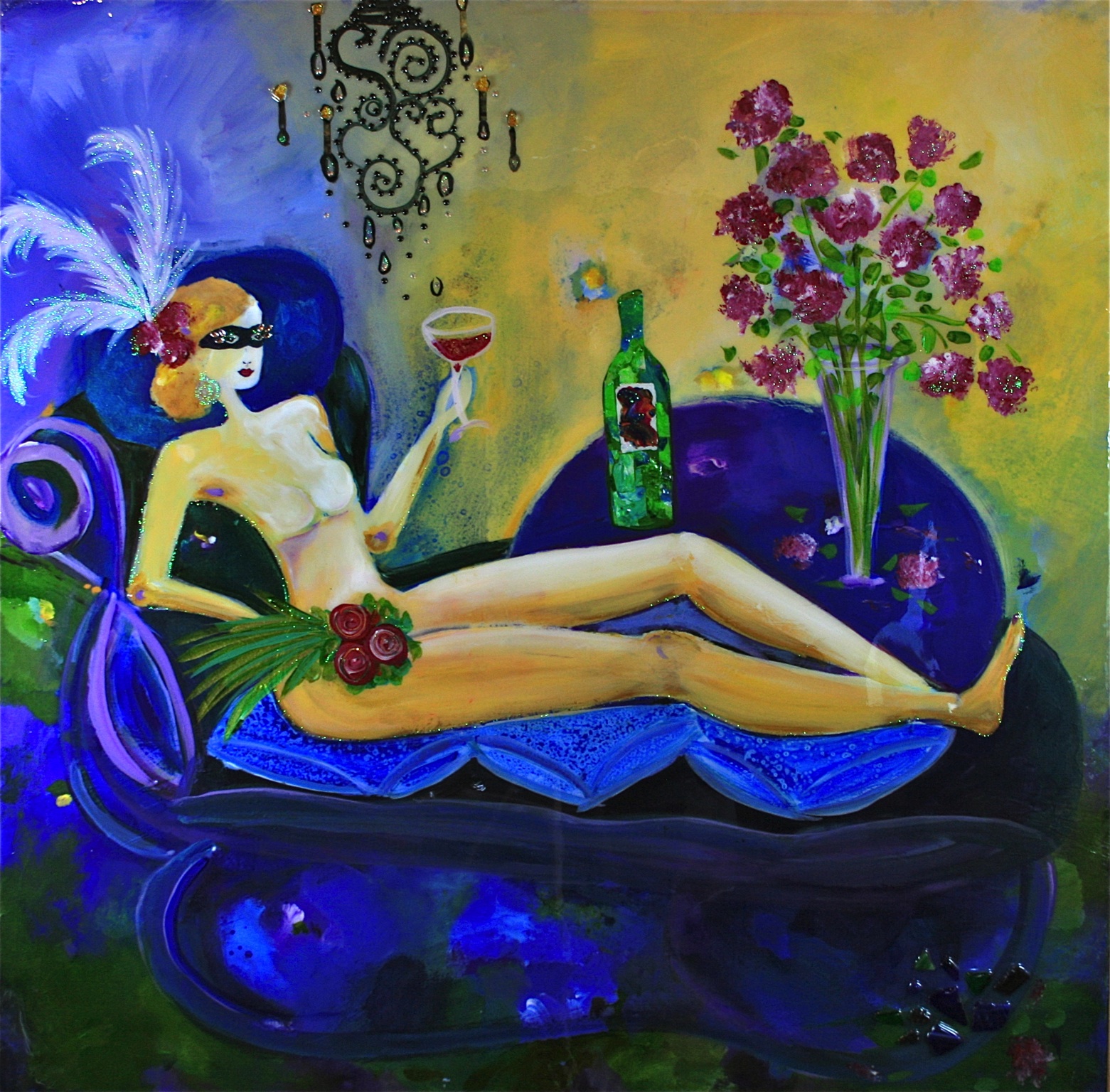 “Marie Antoinette, it turns out, was misrepresented in history. I can’t be sure, I wasn’t there, but many historians say her reputation was villainized from reality starting in her own lifetime. Our modern day American culture glorifies the sacrificing female role model to the point where many modern women feel guilty for doing almost anything for themselves. Marie is the antithesis of what we glorify today, and I say perhaps she has something to teach us. I’ve always felt the kindest thing anyone can do for the ones they love is take care of themselves. You can’t be any good for anyone else if you are not good to yourself first.This painting was directly inspired by Marie Antoinette as a symbol of it being “OK” to take care of yourself, to enjoy life, to celebrate the joy of womanhood, and to embrace being alive as a occasion in itself.