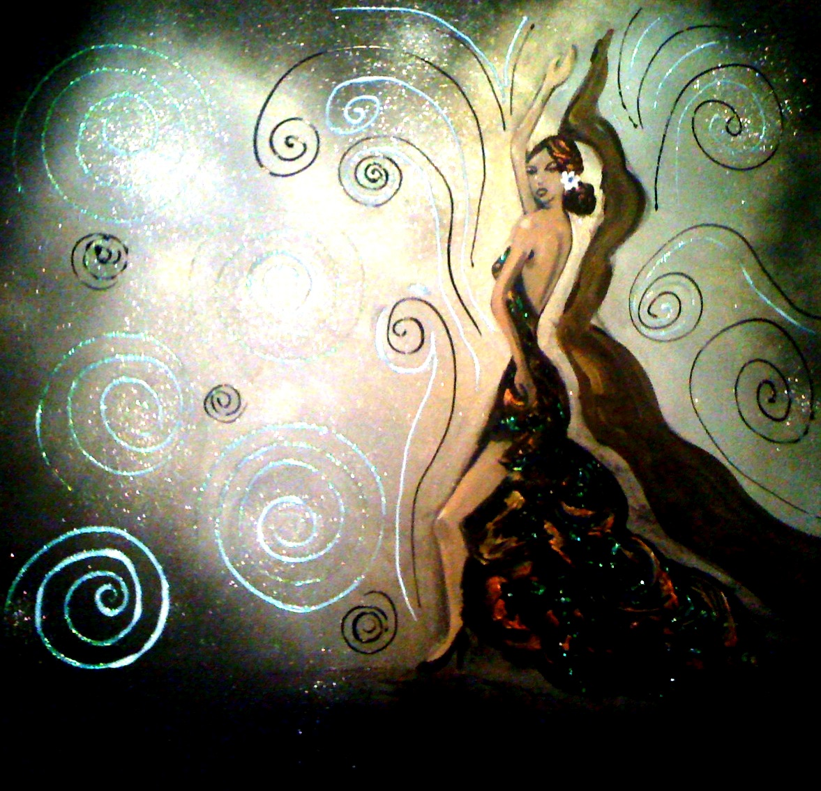“This image recalls the dark bars and clubs where the only light is on the star of the show, the dancer, as she moves her body, uninhibited, as if the music were coming from inside her. I played the music of flamenco as I painted, let the feeling and passion of the song and memories of the movement of dance flow through me as I worked. Cheers to art inspiring art!”