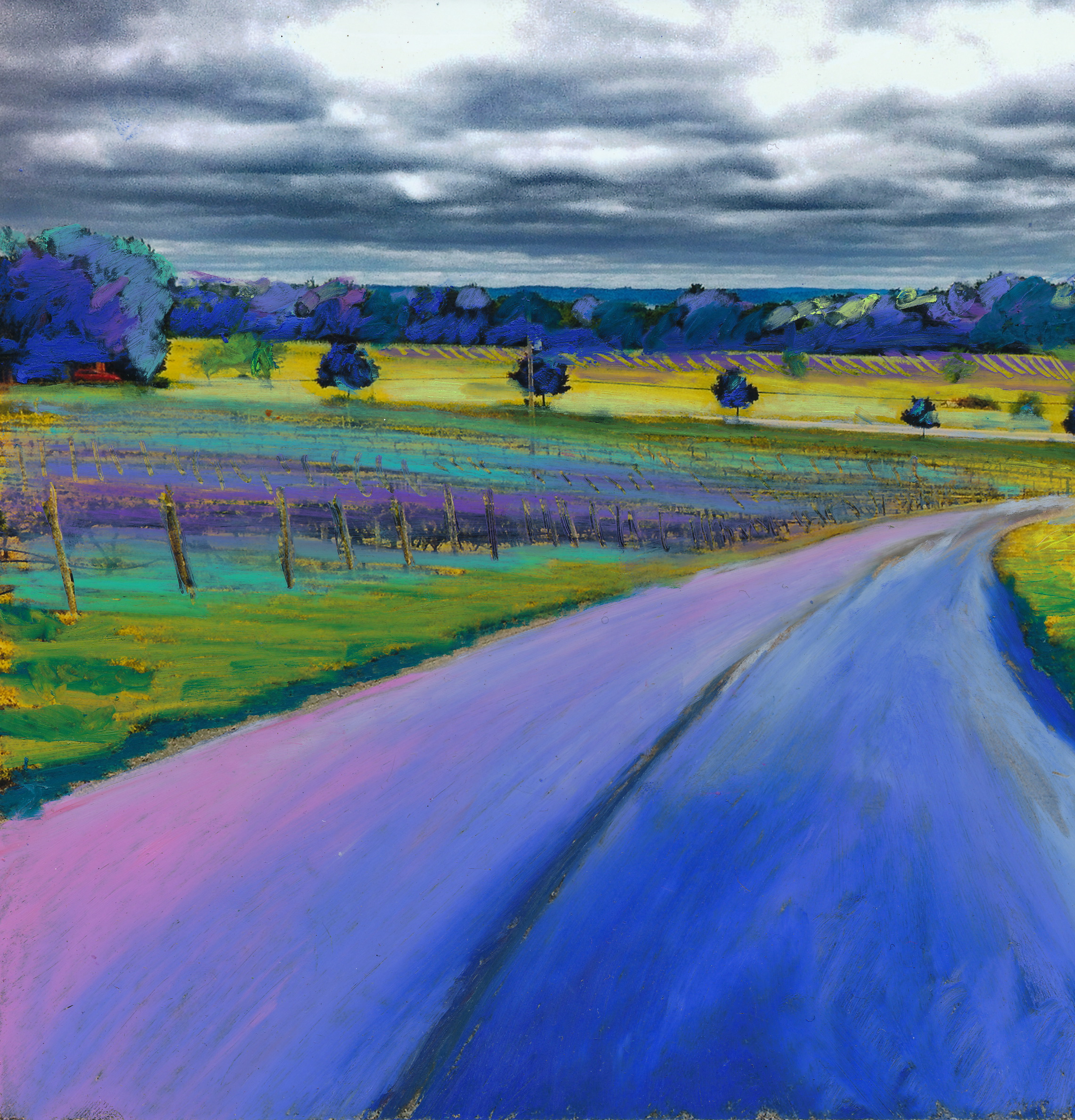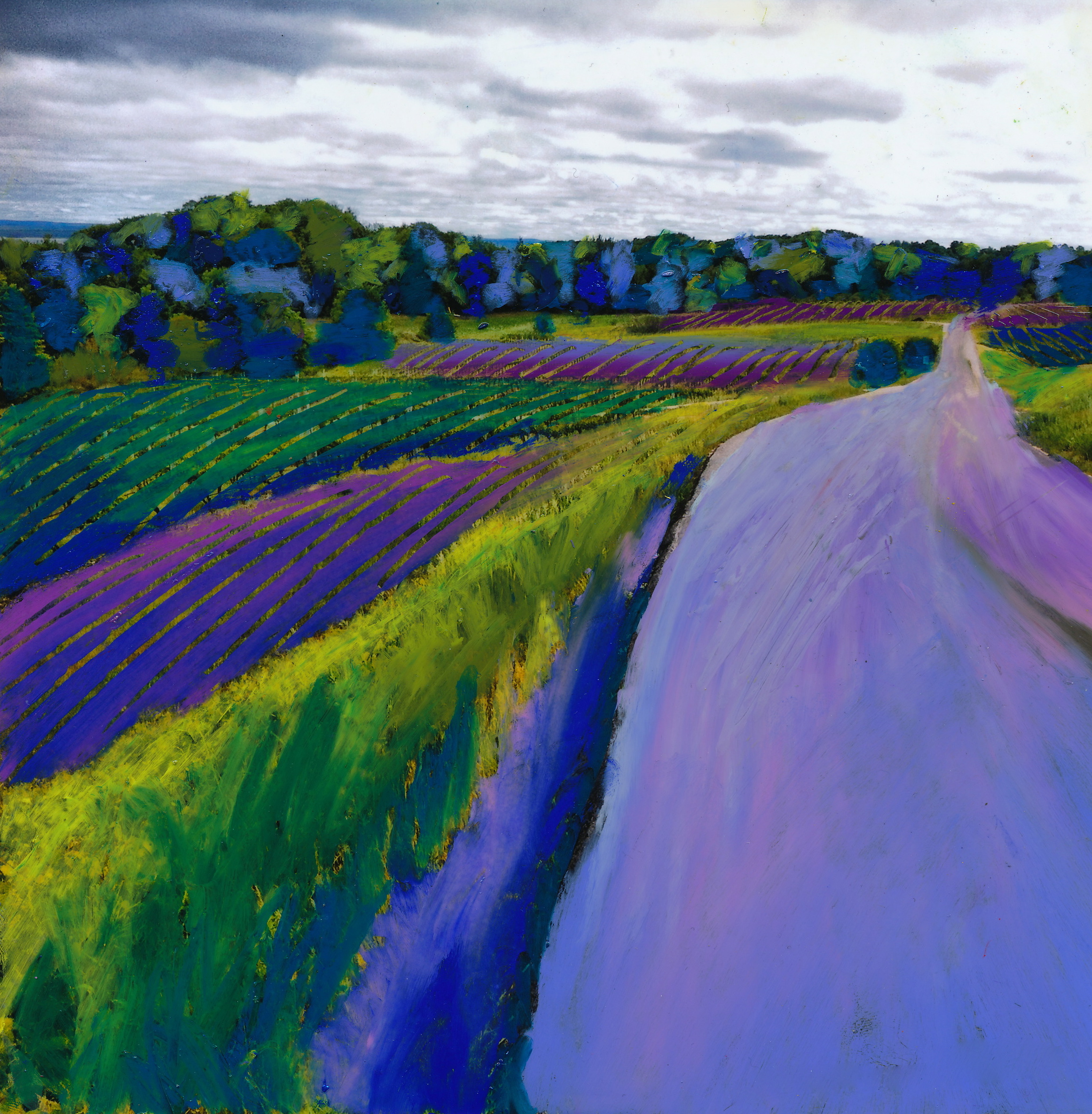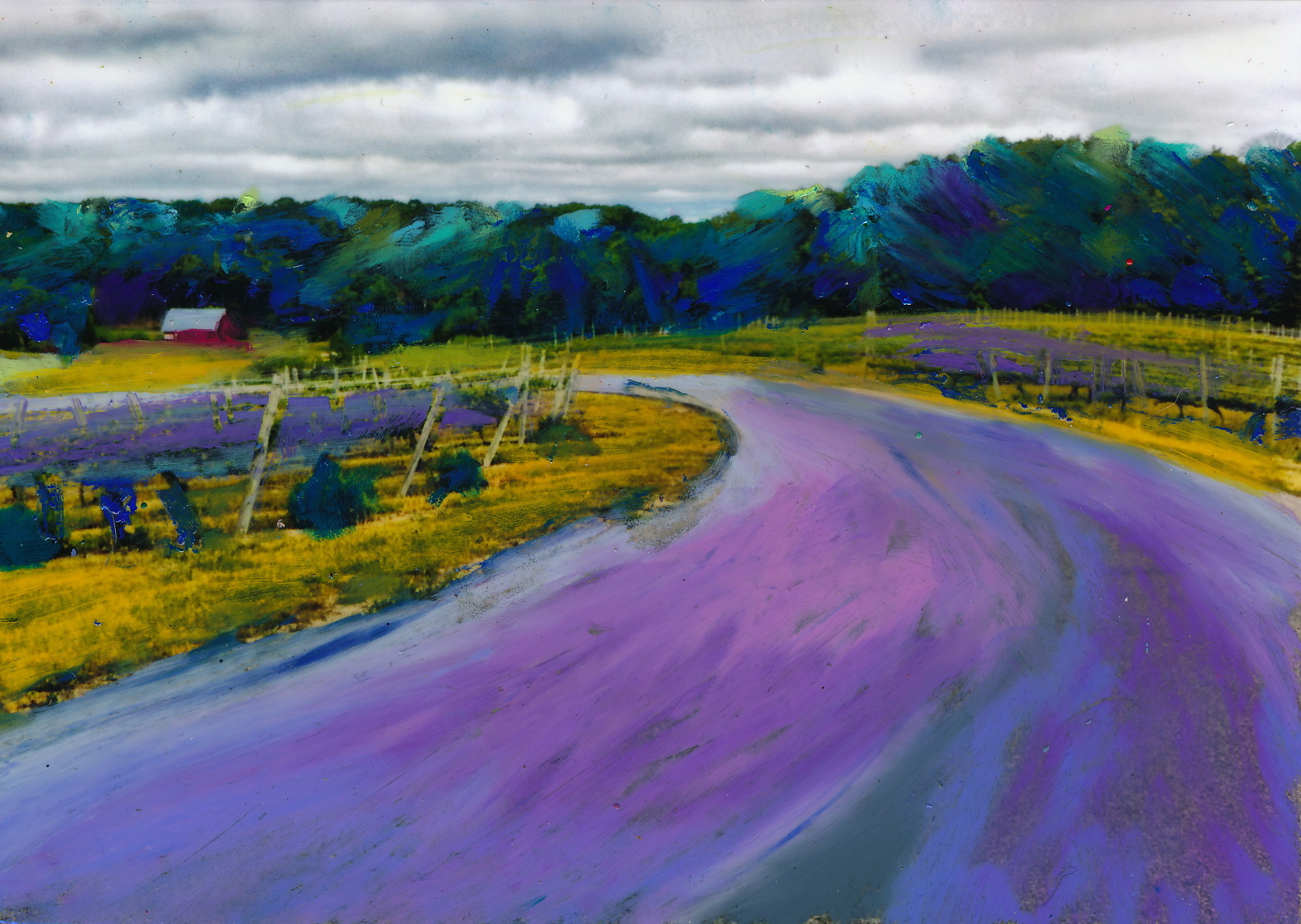 “It is from these many vantage points that I photographed this enchanting place, and from those images created a series of both oil pastel on photo and original mixed media pieces. The road that winds through the property is depicted in each image I have created because I love roads. It’s all about the idea of being on a journey, of passing by beautiful country, of the road less traveled. Travel itself is represented by roads, and this road twists through a magical place. May you be as enchanted viewing the work as I was creating it! Cheers!”